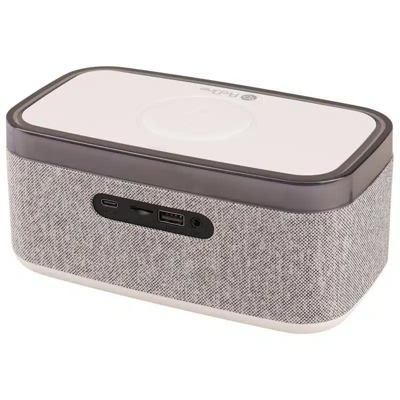 ابعاد:180*100*90 میلی M وزن:820 G نسخه بلوتوث: نسخه 5.3 برد مستقیم بلوتوث: 10 M قدرت اسپیکر: 2*5 وات توان شارژ وایرلس: 15 وات ظرفیت باتری: 1200 میلی آمپر اقلام همراه: کابل شارژ Type C ویژگی ها: قابل تنظیم نور چراغ خواب به وسیله دکمه پاور (امکان تغییر در نور RGB، دارای Hو تنظیم آلارم رادیو)
