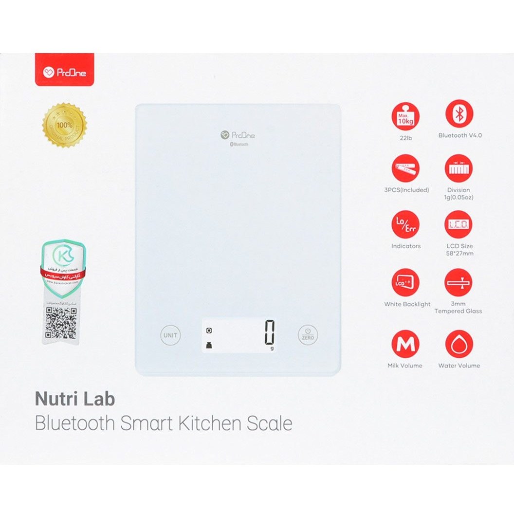 ترازو دیجیتال آشپزخانه پرووان ابعاد: 195*160*210میلی متر جنس بدنه: شیشه+کفه پلاستیکی ABS نسخه بلوتوث: 4.0 اندازه LED: 58*27 میلی متر ظرفیت: 10 کیلوگرم/22 لیتر برنامه: Nutribalan (لطفا از اپ استور یا گوگل پلی دانلود کنید) لوازم جانبی: سه عدد باتری قابلیت ها: قابلیت اندازه گیری حجم مایعات، قابلیت صفر کردن، نشانگر اضافه بار، خاموش شدن خودکار، اندازه گیری میزان کالری،سدیم،چربی،پروتئین،کربوهیدرات،کلسترول، فیبر رژیمی و... ، قابلیت ذخیره سوابق توسط برنامه و مشاهده روند ها، تجزیه و تحلیل مصرف روزانه مواد مغذی و غیره از طریق برنامه