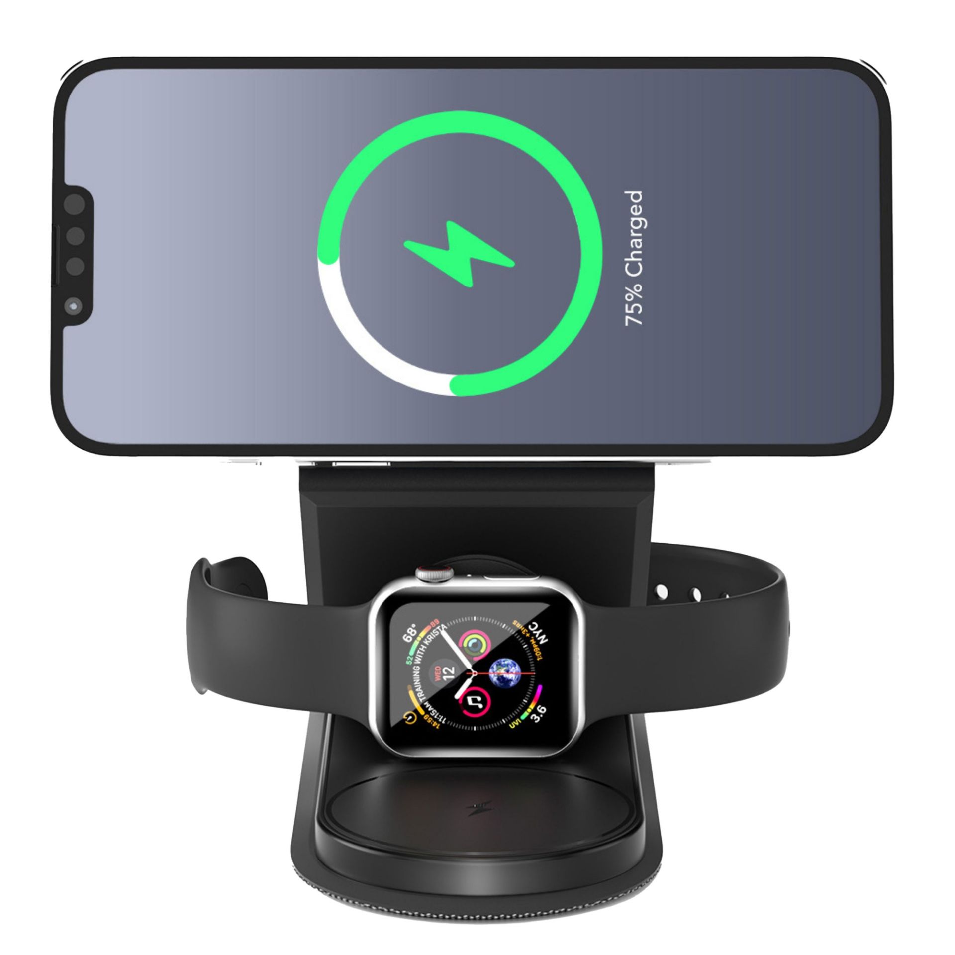 شارژر وایرلس سه کاره جنس بدنه: ABS + PC + FABRIC پورت ورودی: TYPE-C توان خروجی برای موبایل: 15W توان خروجی برای ایرپاد: 5W توان خروجی برای اپل واچ: 2/5W قابل استفاده برای آیفون 12 به بالا، ایرپادهای مگ سیف، اپل واچ اقلام همراه: کابل شارژ دو سر TYPE-C