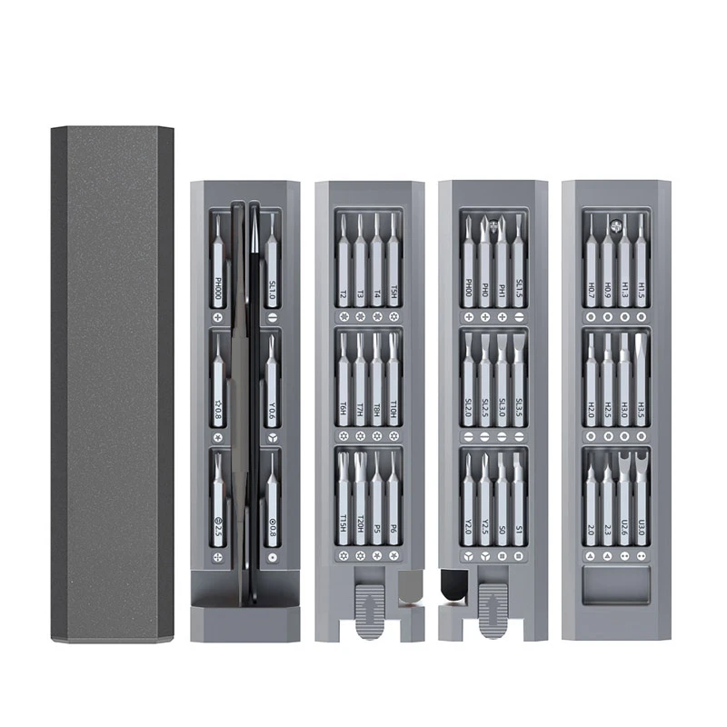 ست پیچ گوشتی 44 در 1 PGS109 ابعاد محصول: 150* 36*36 میلی متر جنس محصول: ABS (بدنه)،S2 , Aluminium (سری پیچ گوشتی) وزن محصول: 732 گرم جزئیات باکس: 1 عدد باکس 8عدد مته H0.7، H0.9، H1.3، H1.5، H2.0، H2.5، H3.0، H3.5 میلی متری 6عدد مته SL1.0، SL1.5، SL2.0، SL2.5، SL3.0، SL3.5 میلی متری 4 عدد متهPH000، PH00، PH0، PH1 میلی متری 3عدد مته (Pentagram): ☆0.8، ☆1.2، ☆1.5 میلی متری 3 عدد مته Y0.6، Y2.0، Y2.5 میلی متری 2عدد مته (Triangle): 2.0 ، 2.3 میلی متری 2 عدد مته S0، S1 میلی متری 2 عدد U2.6، U3.0 میلی متری 1 عدد پین خارج کن (Thimble): 0.8 1عدد ابزار باز کننده (Midplate): 2.5